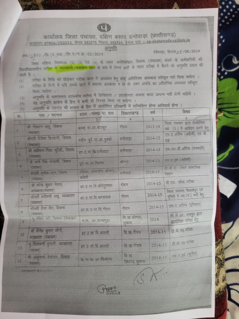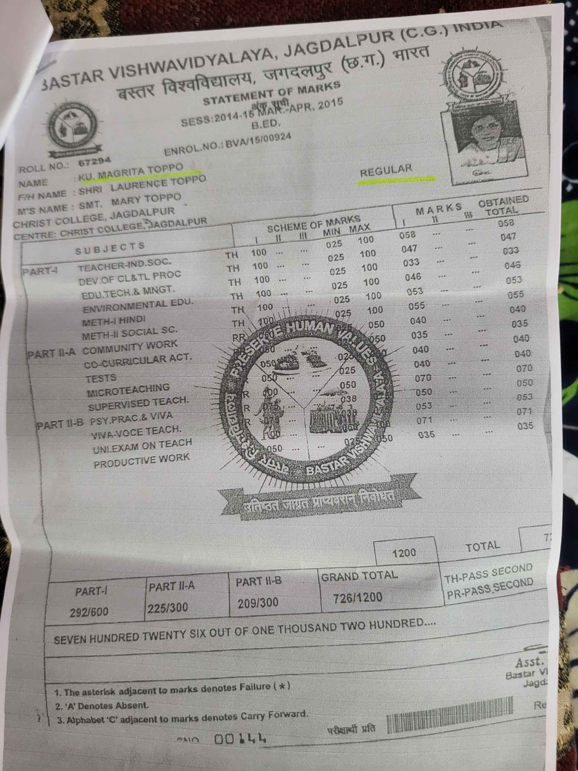 जिला पंचायत ने 28 अगस्त 2014 को अनुमति आदेश (क्रमांक/1800/शि. (पं) स्था. जि. पं. न. क. 06/2014) जारी किया, जिसमें साफ शर्त रखी गई थी कि विश्वविद्यालयीन परीक्षा केवल स्वाध्यायी या पत्राचार माध्यम से ही दी जा सकती है। लेकिन आरोप है कि कुं. मगरिता टोप्पो ने इस शर्त की अनदेखी की और बस्तर विश्वविद्यालय, जगदलपुर से संबद्ध क्राइस्ट कॉलेज, जगदलपुर में सत्र 2014-15 के लिए नियमित छात्र के रूप में प्रवेश लिया। उनका पंजीयन क्रमांक BVA/15/00924 और रोल नंबर 67294 था, जिसके आधार पर उन्होंने बी.एड. परीक्षा उत्तीर्ण की। शिकायत में सवाल उठाया गया है कि अनुमति केवल पत्राचार कोर्स के लिए थी, तो नियमित कोर्स में प्रवेश कैसे संभव हुआ? क्या यहां विश्वविद्यालय और कॉलेज स्तर पर भी अनियमितता बरती गई?